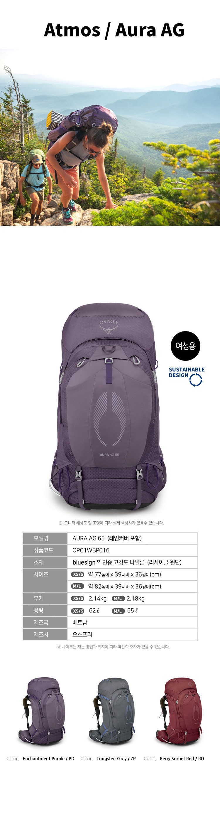 아우라 AG 65L 인챈트먼트 퍼플 여성용