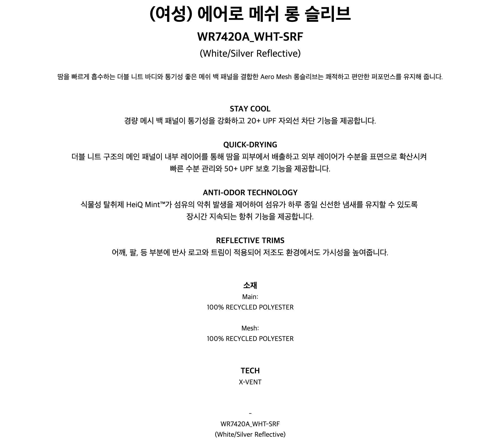 에어로 메쉬 롱 슬리브 화이트 여성용 (WR7420AWHT-SRF)
