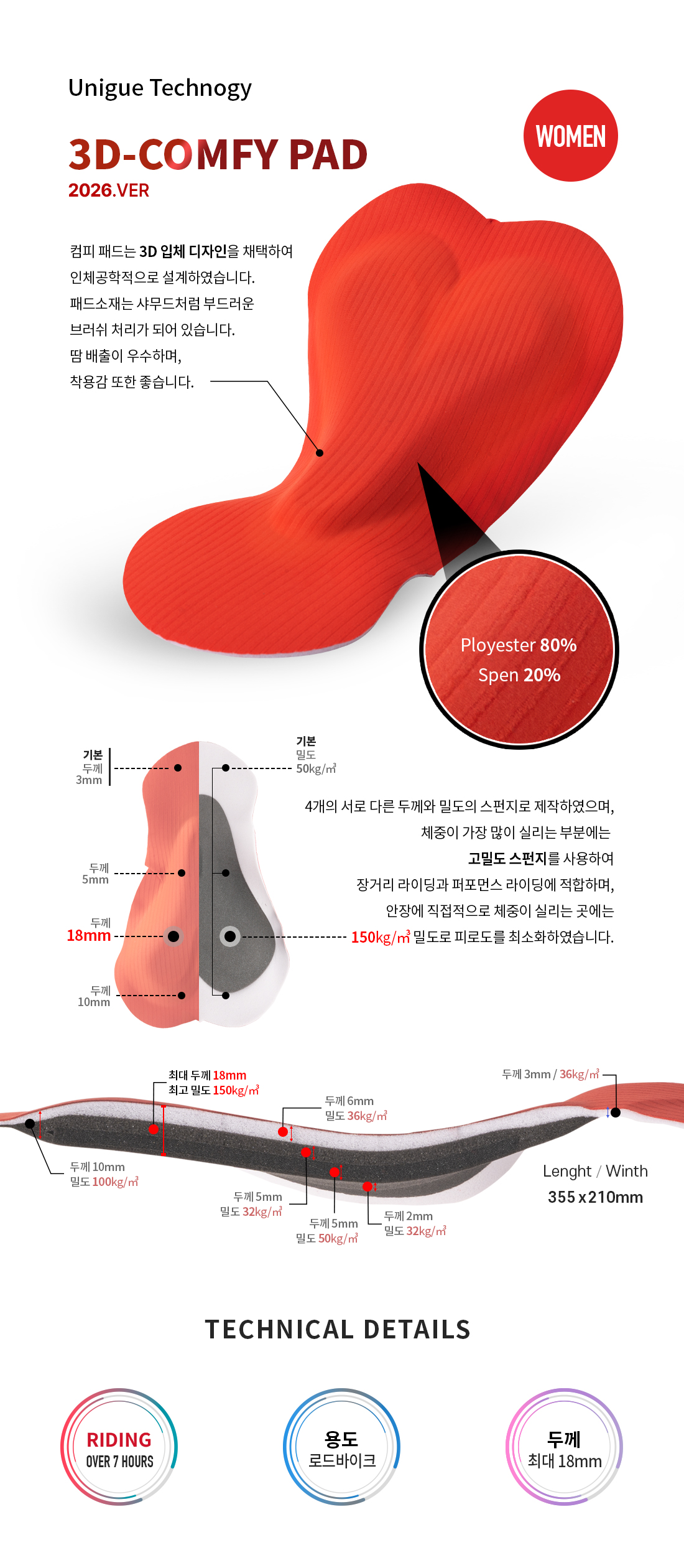 · 패드는 2가지의 다른 밀도로 만들어 장거리시 적합하며, 타공이 되어 있어 땀배출이 좋습니다.